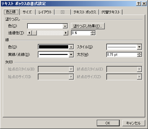 まず「色と線」のタブでテキスト枠の中の色と枠の線について指定します。論文に図を挿入する場合は、枠の線を見えなくしてしまう方が多いと思います。線の色を「線なし」に変更しましょう。
