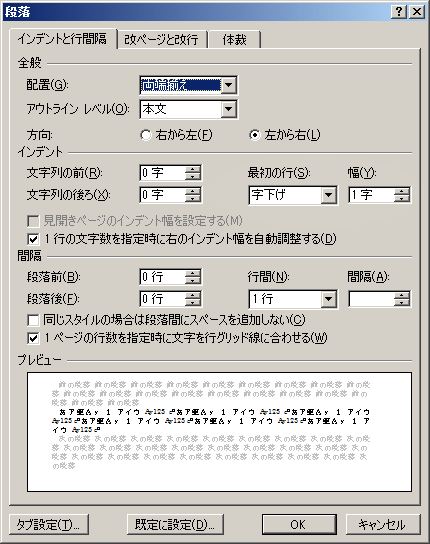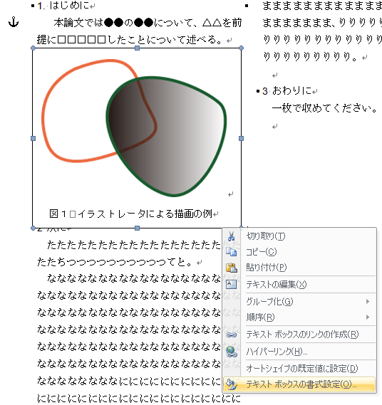おや、図が枠に入りきっていないように見えますね。これは、テキストボックスの中の段落属性が、一行目一字下げになっているからです。