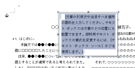 すると、下記のような枠が出て来ます。マウスのドラッグにより大きさを変更してとりあえず適切な場所、大きさに移動してください。枠はマウスでつかんで動かすことも、大きさを変えることもできます。このとき、左に碇のマーク(アンカー)が出ていることに注意してください。「アンカー」は普通は見えませんが、先程の準備作業により見えるようになっています。この後の説明を読めばわかると思いますが、アンカーは見えるようにしておくことが必須です。