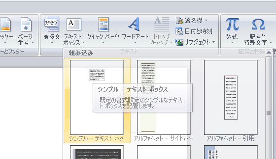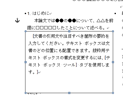 これで、テキストボックスが挿入できます。テキストボックスという名前ですが、テキスト以外もこのボックスの中に入れることができます。誤解を招く名前ですが、昔のWORDでは、レイアウトボックスというものもあり、そちらの方が名前としては適切でした。レイアウトボックスは機能が低かったのでテキストボックスの方に統一されて機能強化されているという歴史があります。