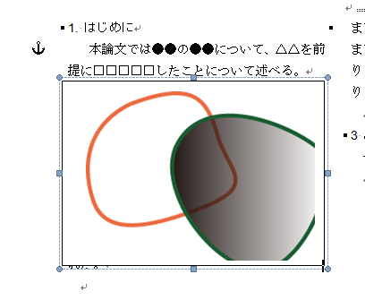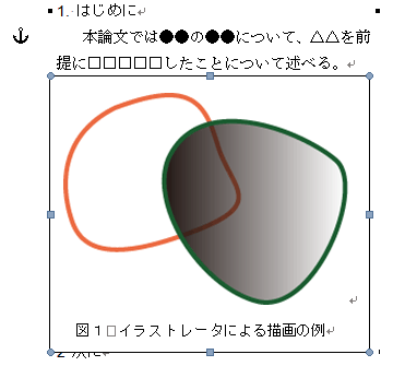 また、碇は段落にくっついています。碇のくっついている段落のテキストを消去すると、図も消えてしまうので注意しましょう。これで困っている人が多いようですが、碇を表示することがまず大切です。