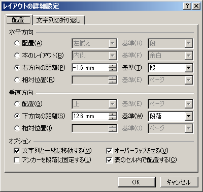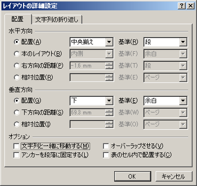 なお、「行内」は、グラフィクスで描いた式などのように、直前の文章と図が離れたら困る場合に使用します。これを選択した場合は碇を使うことはなくなりますので以下の設定は必要ありません。