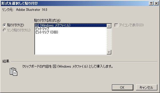そして、その図を流し込みますが、そのときCtrl-V を使わないことが重要です。代わりに、「貼り付け」→「形式を選択して貼り付け...」を行います。すると、下記のダイアログが出て来ます。これはイラストレータから図を貼り付ける場合の例です。貼り付け元がマイクロソフトのツールの場合は、他にも色々な形式が選択肢として出て来ると思います。しかし、必ず「図」を選択することが重要です。特にマイクロソフトのツールからの貼り付けの場合、元のデータ形式が残されているとWORDの中でそのまま編集できたりして便利です。図として貼り付けるとそのようなことはできなくなりますが、データが軽くなる上、仕上がりもきれいなので、図として貼り付けるのが良いようです。また、図として貼り付ける場合、横幅を枠の幅に自動的に調節してくれます。