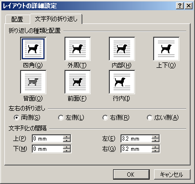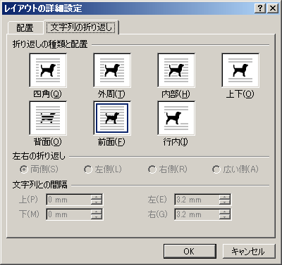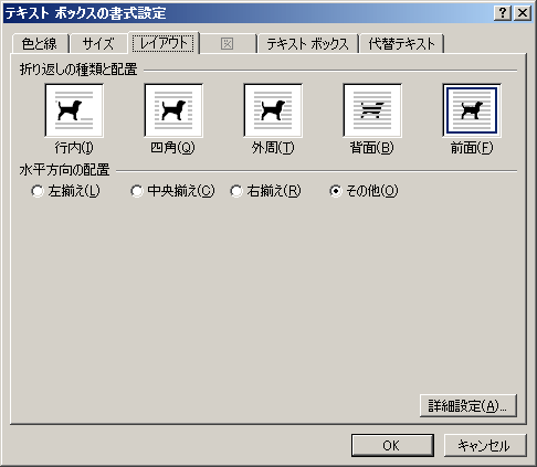 折り返しの種類と配置が、デフォルトで「前面」になっています。これが、枠が本文の文字を隠している原因です。そこで、これを変更するわけですが、この設定ダイアログでは十分な設定ができません。そこで「詳細設定...」をクリックします。