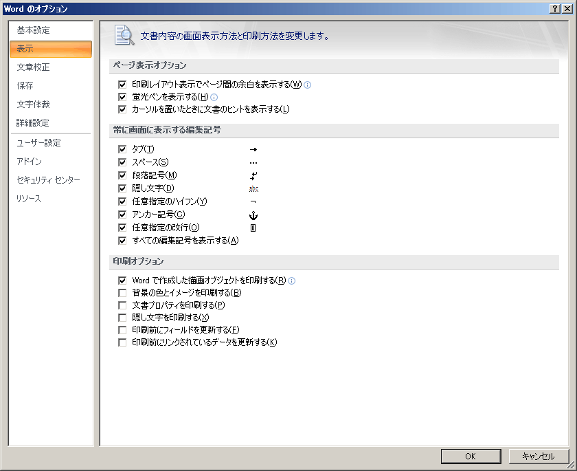 「常に画面に表示する編集記号」のオプションで「アンカー記号」を必ずチェックします。ページ表示オプションの「印刷レイアウト表示でページ間の余白を表示する」もチェックした方が良いでしょう。