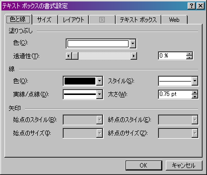 まず「色と線」のタブでテキスト枠の中の色と枠の線について指定します。論文に図を挿入する場合は、枠の線を見えなくしてしまう方が多いと思います。線の色を「線なし」に変更しましょう。