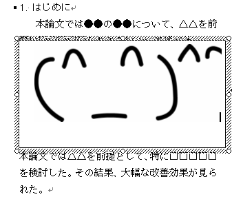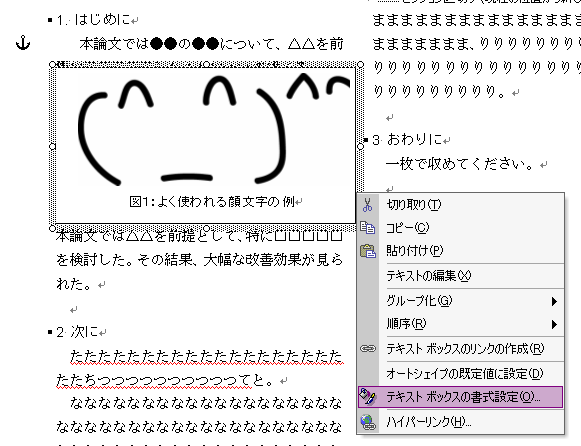 この後で図の位置を動かすには、「碇」をマウスでつかんで動かすだけで、その碇のあるページや段に図が移動してくれます。ページ間で碇を移動させることも可能です。このとき、碇ではなく枠の方をマウスで掴んで動かしてしまうと、配置のオプションがリセットされてしまうので気をつけましょう。