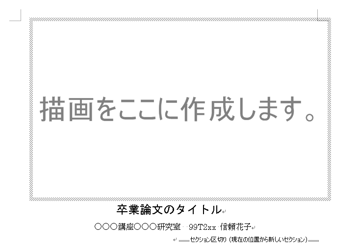 すると、下記のように、「描画をここに作成します」という枠が出て来ます。これは無視してマウスのドラッグにより自分で枠を書き直した方が良いでしょう。枠はマウスでつかんで動かすことも、大きさを変えることもできます。