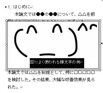 次に、図のキャプションも書いてしまいましょう。図のキャプションは貼り付けた図の後に改行を入れて、普通に文字でかけばいいです。ただし、このとき枠を下に広げる必要が出て来ることが多いので、そのような場合はマウスで枠も広げましょう。さらに、図のキャプションの書式も指定されたものにしてください。ここではゴシック体の10pt, 中央揃えとします。
