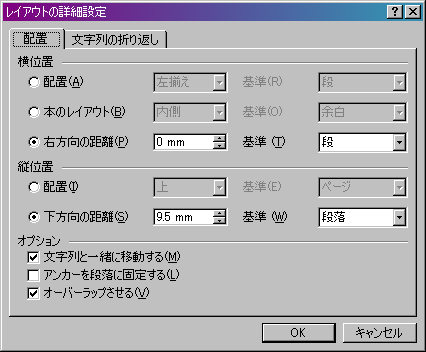 「横位置」「縦位置」が一番下の「右方向の距離」「下方向の距離」でデフォルト設定されています。これはマウスで枠を移動したためです。仕上げの段階では、枠は上とか下にまとめるのが適切です。そのため、いずれも最初の「配置」を選択します。(図表はページの上か下にまとめてください。ページの途中に図があって地の文が上下に別れるのは避けてください。特に、1~2行の少ない行数の地の文が上や下に残るのは絶対避けてください。文字列の折り返しのところで「行内」を指定したままだと、そうなりがちです。)