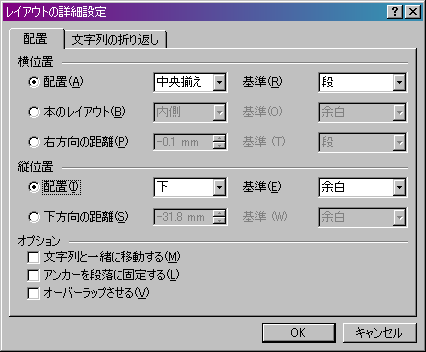 なお、「行内」は、グラフィクスで書いた式などのように、文章と図が離れたら困る場合に使用します。これを選択した場合は碇を使うことはなくなりますので以下の設定は必要ありません。