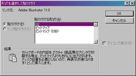 そして、その図をさきほど作った枠の中に流し込みますが、そのときCtrl-V を使わないことが重要です。代わりに、「編集」→「形式を選択して貼り付け...」を行います。すると、下記のダイアログが出て来ます。これはイラストレータから図を貼り付ける場合の例です。貼り付け元がマイクロソフトのツールの場合は、他にも色々な形式が選択肢として出て来ると思います。しかし、必ず「図」を選択することが重要です。特にマイクロソフトのツールからの貼り付けの場合、元のデータ形式が残されているとWORDの中でそのまま編集できたりして便利です。図として貼り付けるとそのようなことはできなくなりますが、データが軽くなる上、仕上がりもきれいなので、図として貼り付けるのが良いようです。また、図として貼り付ける場合、横幅を枠の幅に自動的に調節してくれますので大きさにも気をつかわなくてすみます。