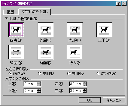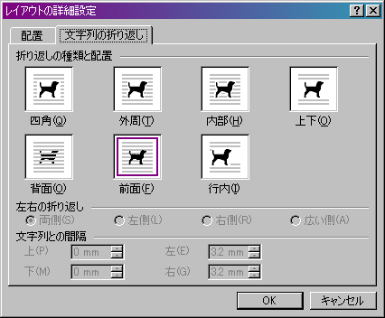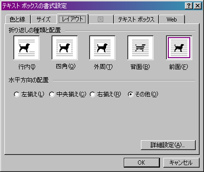 折り返しの種類と配置が、デフォルトで「前面」になっています。これが、枠が本文の文字を隠している原因です。そこで、これを変更するわけですが、この設定ダイアログでは十分な設定ができません。そこで「詳細設定...」をクリックします。