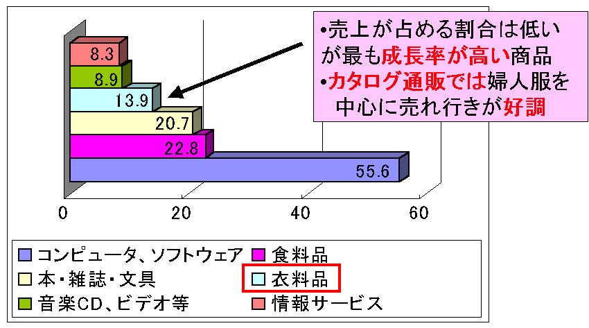 下の統計は、1998年の通信白書からの引用で、インターネットを用いたオンラインショッピングにおける品目別の売れ行きを示したものです。最も多いのはコンピュータ関係のものです。これは、インターネットユーザが必ずコンピュータユーザであり、またコンピュータに興味を持っていることから当然でしょう。第二位は食料品。これは中元・歳暮や各地のグルメ特産品などでしょう。第三位は本・雑誌・文具であり、第四位に衣料品が入っています。私たちは、この衣料品に注目しています。