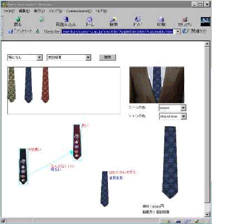 このように考え、実際にインターネットを用いて複数の人がどのようなショッピング行動をとるのか調査したり、協調のモデルを検討したりしています。1998年度は、西陣織工業組合様の協力により、ネクタイを素材にしたショッピングインタフェースを試作しました。下図はその試作品です。