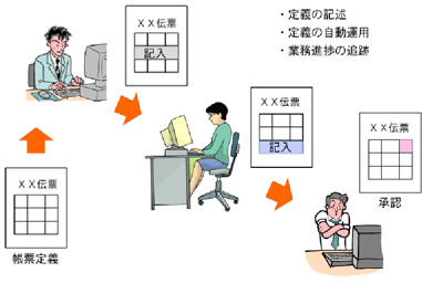 これも、よく聞くことばですね。ワークフローとは、何人かの人が順番に仕事をしていく、オフィスの流れ作業です。ワークフローシステムとは、そのような流れ作業の手順を定め、手順通りに仕事が進められるように電子書類を管理し、人々に仕事を依頼したり督促したりします。また、どこまで仕事が進んでいるのかを常に把握し、マネージャにいろいろな情報を提供します。
